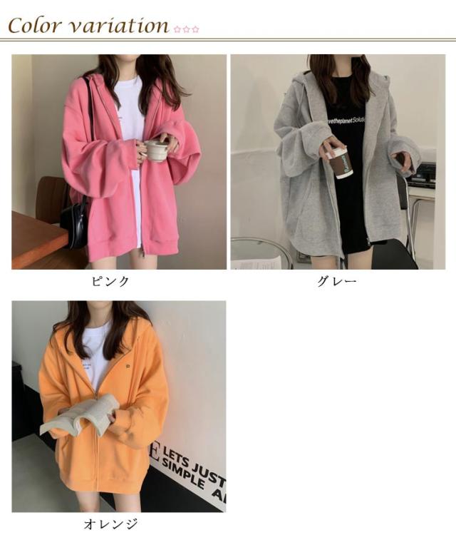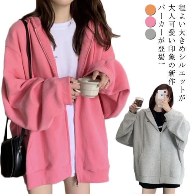 スウェット パーカー ロング ジップアップパーカー 裏毛 レディース スウェットパーカー ワンポイント フード付き オーバーサイズ 薄手 アウター 羽織り 春 秋 冬 ライトアウター 無地 秋物 秋服 長袖 トップス カジュアル ピンク オレンジ 【送無】