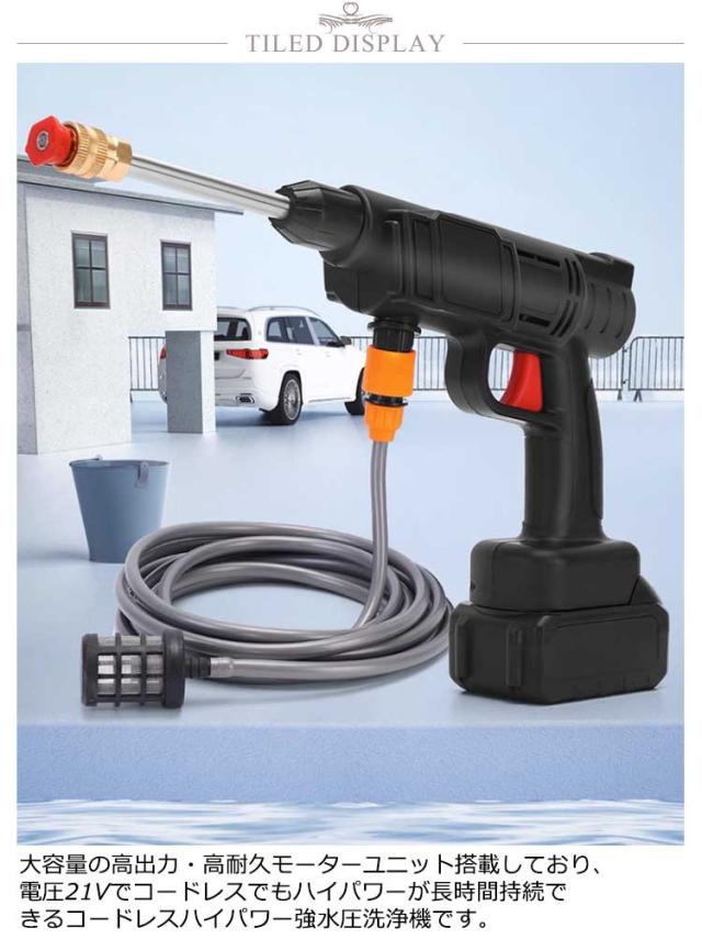 | バッテリー2個+充電器+収納ケース 大容量の高出力・高耐久モーターユニット搭載しており、電圧21Vでコードレスでもハイパワーが長時間持続できるコードレスハイパワー強水圧洗浄機です。 取り回しが良い充電式コードレス高圧洗浄機なので、電源がない場所でも使用可能です。バケツなどに入れた水をくみ上げる吸水タイプで、専用タンクがないので場所を選ばず使えます。 3つのノズルがついており、直噴・拡散・フォームポットの3つの水流を生み出します。圧力ノズルと組み合わせることで、さまざまな作業に対応でき、環境に応じた洗浄方法を選択できます。バッテリー 併用 車やお掃除中に突然電池切れのご心配はいりません。 車やバイク、自転車などの洗車、ベランダ・浴室・外壁の掃除やコケ落とし、ガーデニング・水やり、お墓の掃除、アウトドア、キャンプ・BBQ用品の片付け・清掃にも大活躍。 | |