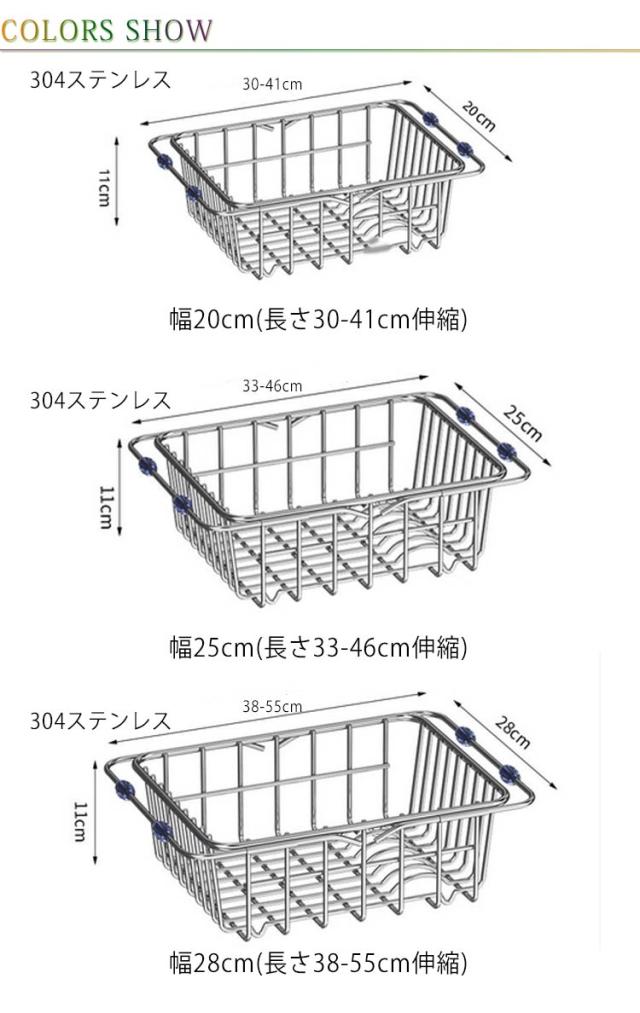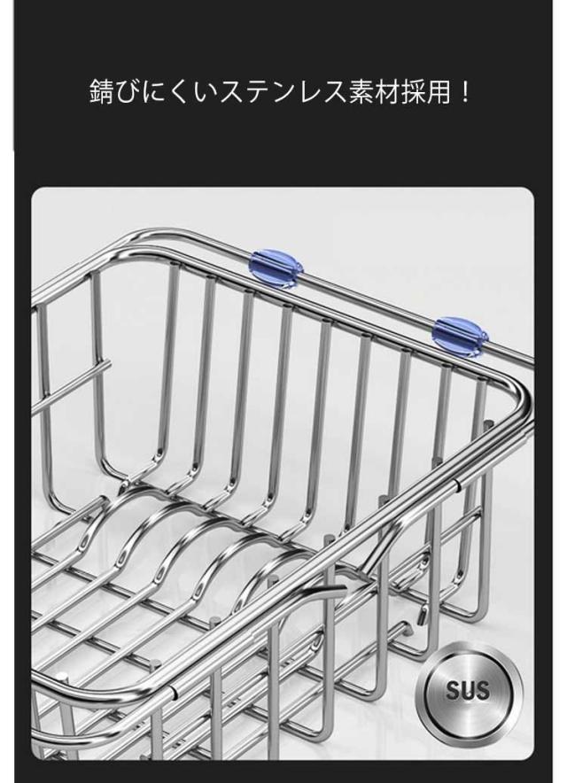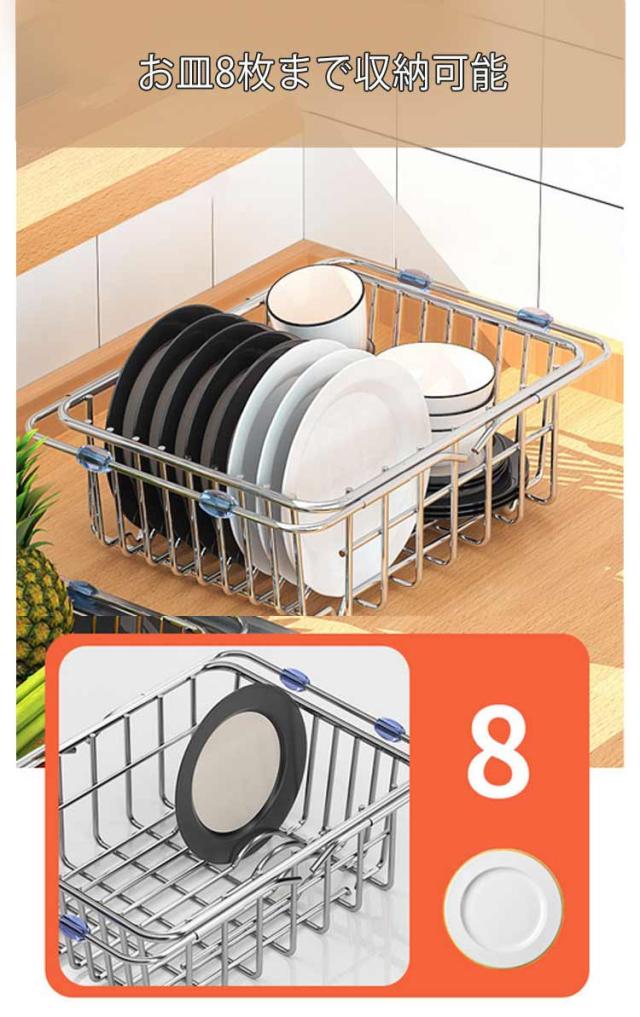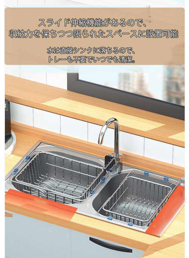 | 伸縮式でシンクにフィットする水切りバスケット。 スライド伸縮機能があるので、収納力を保ちつつ限られたスペースに設置可能。 シンク内に設置し、洗った食材の一時置き、料理の作業スペース、食器の水切りに最適。 錆びにくいステンレス素材採用! お皿8枚まで収納可能。 お皿とお皿の間に適度な間隔が開き、空気の通り道ができるので、より効率よく水切りが出来る。 水は直接シンクに落ちるので、トレーも不要でいつでも清潔。 | |