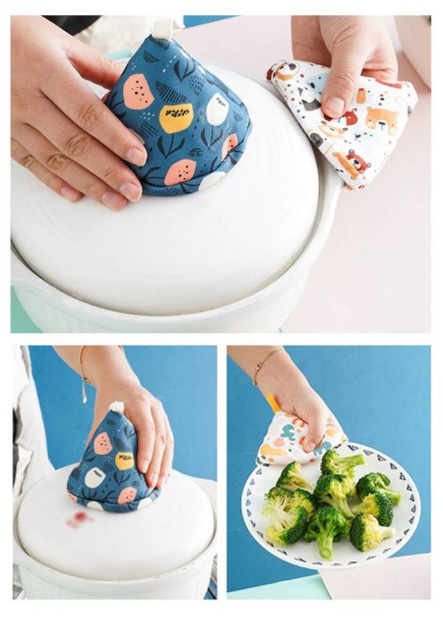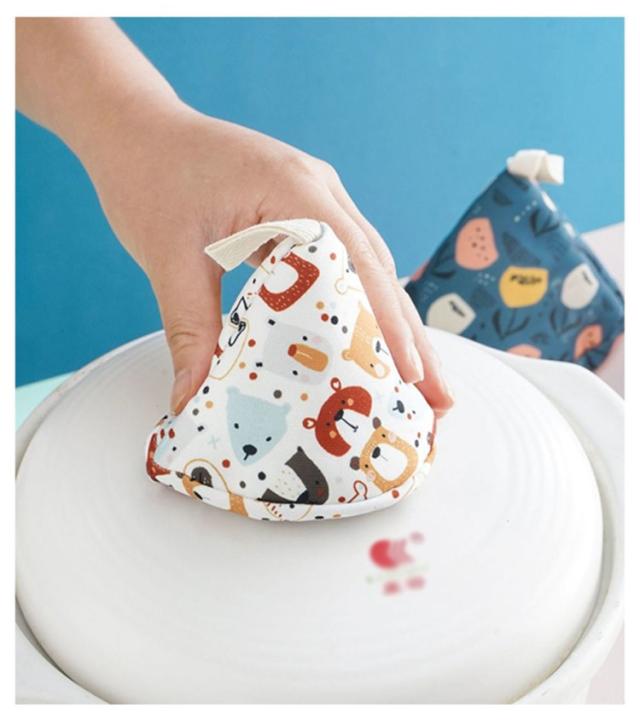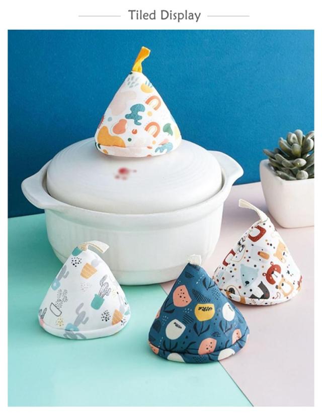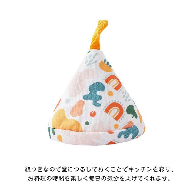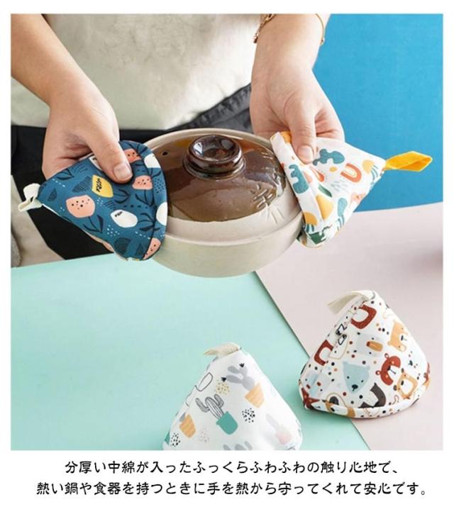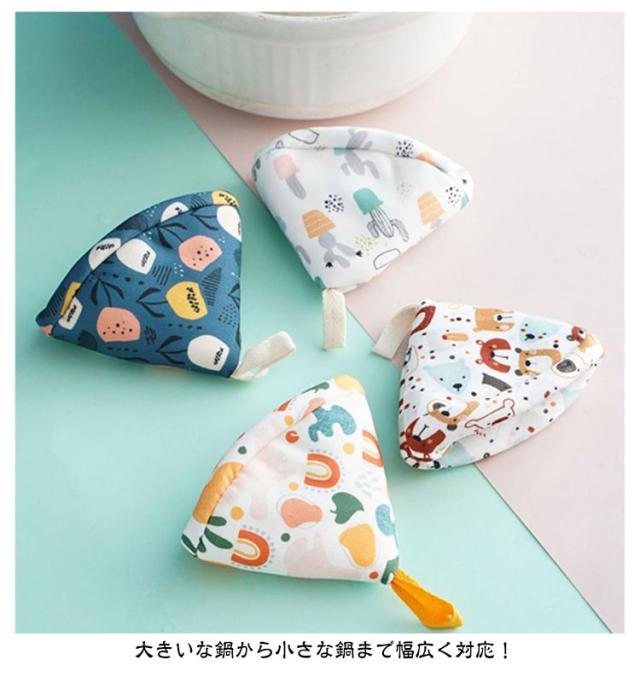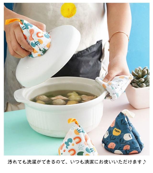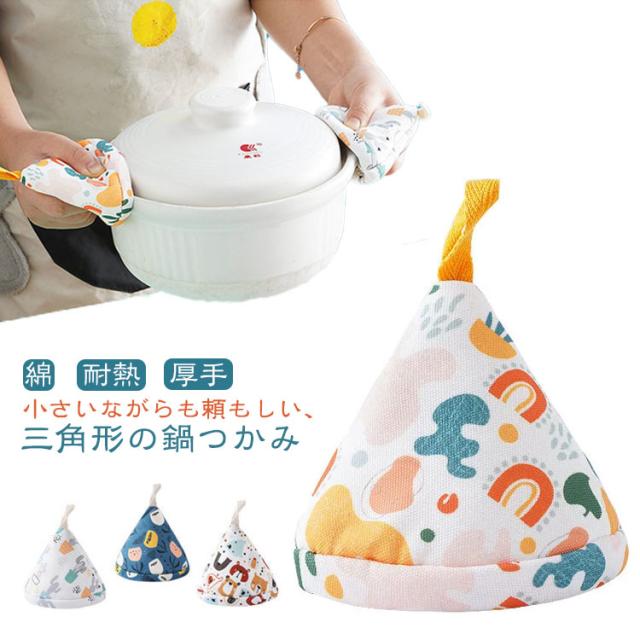 | 小さいながらも頼もしい、三角形の鍋つかみ ころんとした三角形が鍋の蓋や取っ手にピッタリはまり、機能性も抜群。 大きいな鍋から小さな鍋まで幅広く対応! 分厚い中綿が入ったふっくらふわふわの触り心地で、熱い鍋や食器を持つときに手を熱から守ってくれて安心です。 紐つきなので壁につるしておくことでキッチンを彩り、お料理の時間を楽しく毎日の気分を上げてくれます。 汚れても洗濯ができるので、いつも清潔にお使いいただけます♪ コンパクトなのでキャンプなどアウトドアのお供にも◎ | |