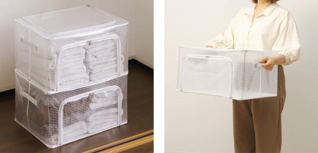 | しまった物がすぐに見つけやすい 半透明になっているので中身が見えてしまったものが見つけやすくなっています。 | 便利な取っ手付き 持ち運びに便利な取っ手がついています。 |