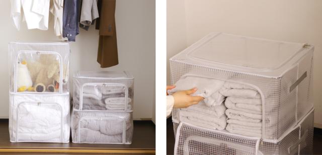 積み重ねて増やせるのでクローゼットなどの空いたすき間を活用出来る便利なボックスです。半透明で中身が見えるのでお子様のおもちゃや洋服、布団など様々なものを入れてすっきり片付ける事が出来ます。