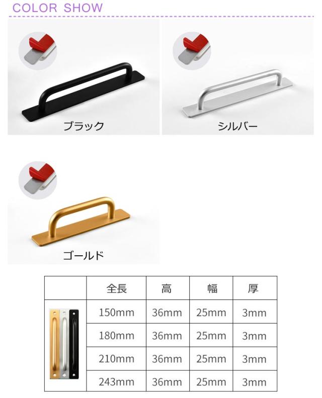 | 取り付け簡単!粘着タイプの取っ手。 引き出しハンドルは、アルミニウム素材を使用します。表面が滑らかなので使い心地も良く、傷の心配もありません。安心してお使いいただけます。 シンプルでモダンなデザインでどんな場所でも違和感なくマッチします。 釘なし接着剤のの取り付け:?必要な釘なし接着剤を用意する。?釘なし接着剤を取手の底に均一に塗ります。?必要な取り付け位置に貼り、手で押します。?インストールが完了してから72時間で正常に使用できます。 ネジの取り付け:?ねじ正面固定木戸用ドライバでねじを締め付ける。?ネジを締めて取り付け完了! | |