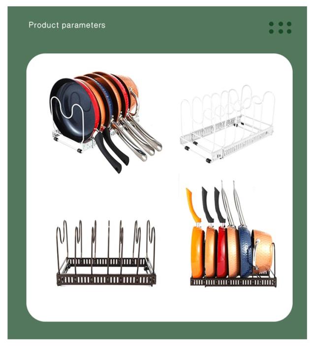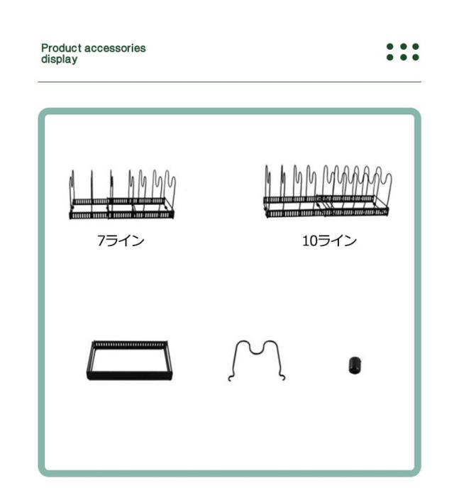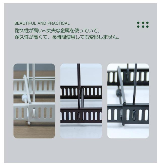 | 多機能なフライパン収納ラック~様々なフライパンを収納だけではなく、鍋蓋、まな板等を置くことも可能です。食器棚、シンクでのご使用に最適です。 簡単な組み立て式~鍋や蓋などの厚みに合わせて、仕切りパーツを本体の内側からスロットに挿入して固定します。他の道具が不要で、簡単に組み立てできまたは取り外しできます。 伸縮可能なフライパンスタンド~本体は30.9〜58cmに伸縮できます!仕切りパーツ10本が付属しており、フライパン、鍋や蓋などのサイズに合わせて調整可能です。 空間を節約~最大11個のフライパンか蓋が収納できる鍋ラックです。キッチンの空間節約にとって活用できます。 耐久性が高い~丈夫な金属を使っていて、耐久性が高くて、長時間使用しても変形しません。 | |