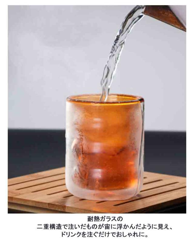 | まるで飲み物が宙に浮ているかのように見える二重構造のグラスです。 二重構造のコップはガラスとガラスの間に空気の層を作る事により、断熱効果があり、冷たさ、熱さをより長くキープします。 耐熱ガラスの二重構造で注いだものが宙に浮かんだように見え、ドリンクを注ぐだけでおしゃれに。 余計な印刷や柄がない秀逸なデザインが食卓や他のインテリアの邪魔をしません。 コーヒーはもちろん、紅茶、お茶、お酒などにお使いいただけます。 食洗機の使用も可能ですので、デイリーにお使いいただけます。 | |