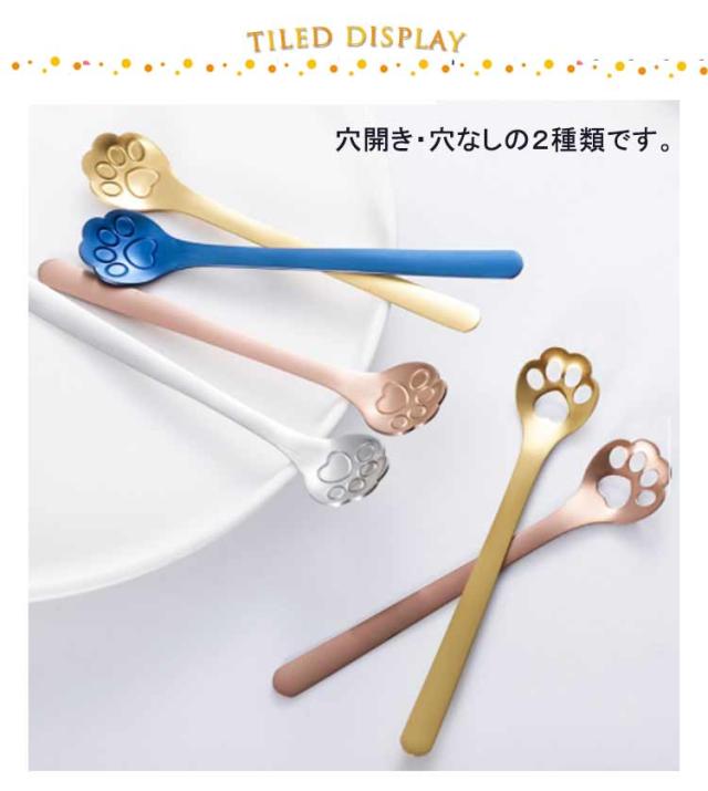 | とても可愛らしい肉球デザインのスプーン。【8本セット】 耐食性・耐久性に優れた304ステンレスを採用。 穴開き・穴なしの2種類です。 ゼリーやプリン、ヨーグルト、アイスクリームを食べるのにぴったり! お客さまのおもてなしに、コーヒースプーンとしても便利で喜ばれます。 毎日のカフェタイムが楽しくなりますね。 | |