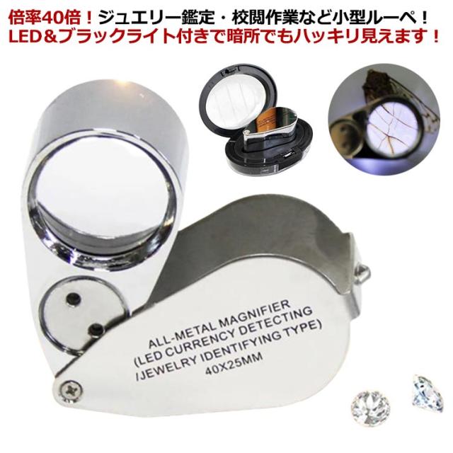 ジュエリールーペ 倍率40倍 LEDライト付き 拡大鏡 ルーペ 虫眼鏡 折り畳み 携帯用 軽量 コンパクト 宝石鑑定 貴金属鑑定 ダイヤモンド 多機能 送料無料