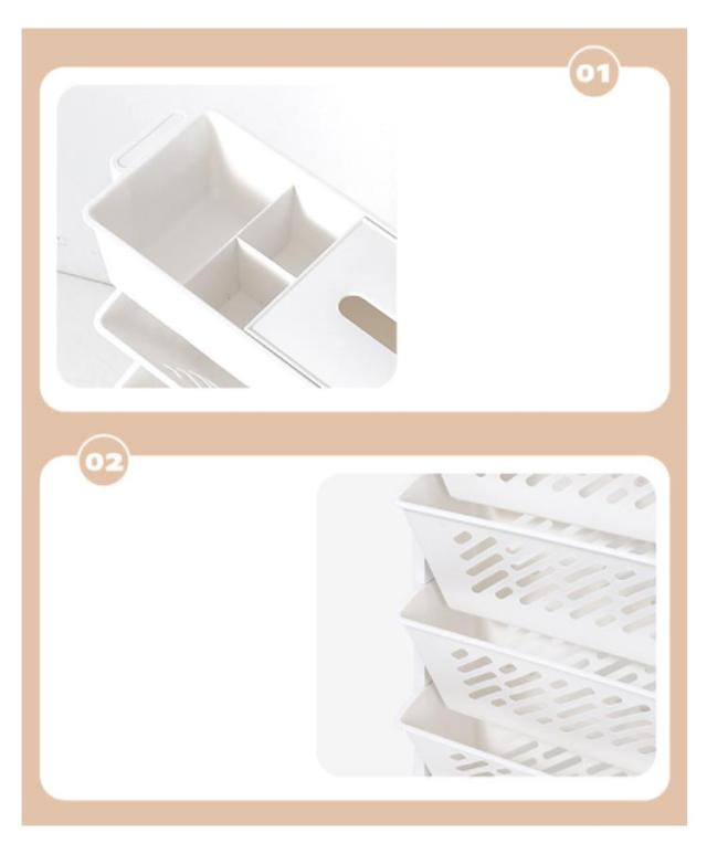 | 【5段 キャスター付き テーブル下 収納 ワゴン】 たっぷりの書類やファイル、封書などを整頓できる収納ワゴン。 キャスター付きなのでスムーズに移動ができ、お掃除やお部屋の模様替えなどでの移動もスイスイ。 環境にやさしいプラスチックで作られており、お手入れも簡単です。 大容量で収納力抜群! 間仕切り設計された、書籍、雑誌、ノート、料理本、辞書、漫画本、フォルダ、文房具、テーブルパーツを一口にまとめて収納できます。 上トレイは小物を置くのに便利です。 「見せる収納」として考えれられる方にはお勧めです。 コンパクト設計なのでリビング、オフィス、美容室、子供部屋様々な場面で大活躍。 | |