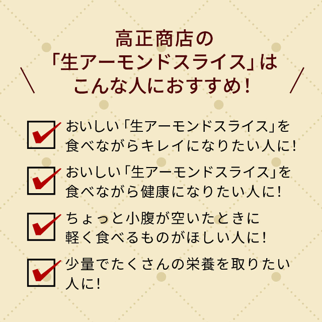 高正商店の「生アーモンドスライス」は、添加物不使用!食塩不使用!アメリカ産の上質なアーモンドをスライスしました。 アーモンドは、ミネラルのバランスが良く、食物繊維やビタミンE、オレイン酸なども豊富で栄養満点です。お菓子作りやパン作り、お料理の材料やトッピングにお使いください!