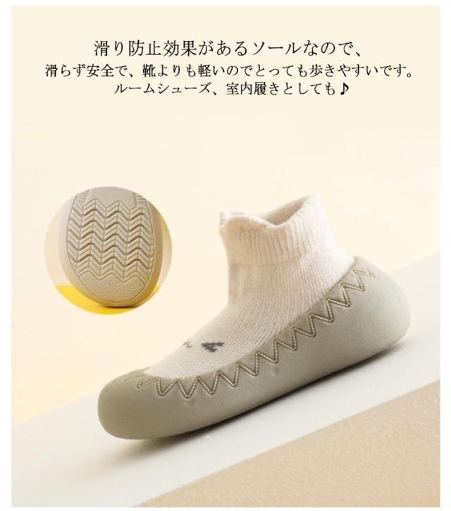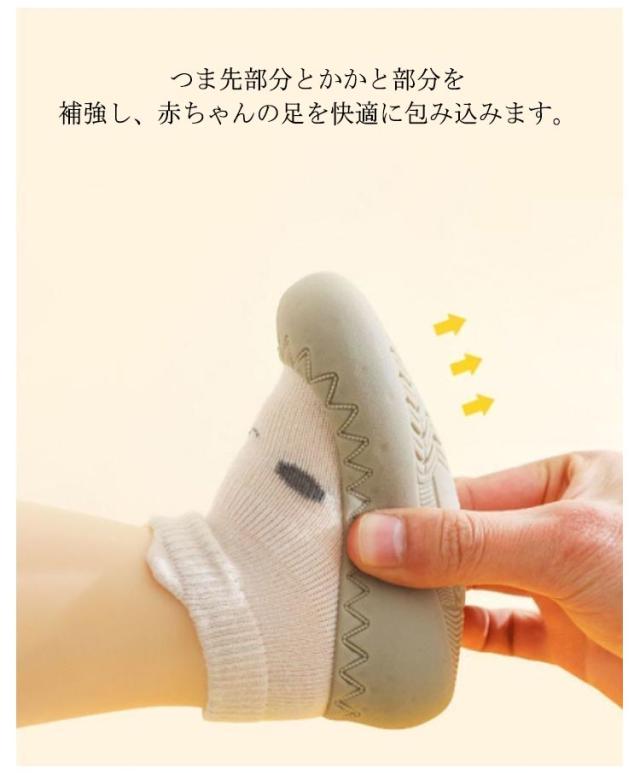 | 柔らかくて気持ちいいソックスキッズシューズです。 滑り防止効果があるソールなので、滑らず安全で、靴よりも軽いのでとっても歩きやすいです。ルームシューズ、室内履きとしても♪ つま先部分とかかと部分を補強し、赤ちゃんの足を快適に包み込みます。 ソール部分が柔らかいので、つま先とかかとにきちんと力を入れることができます。 脱げにくい伸縮性のある靴下の履き口になっています。 手洗い、または洗濯機で洗えるのでいつでも清潔にお使い頂けます。 | |