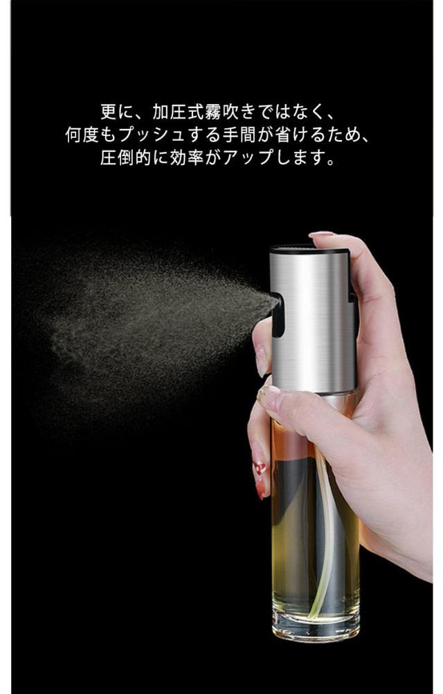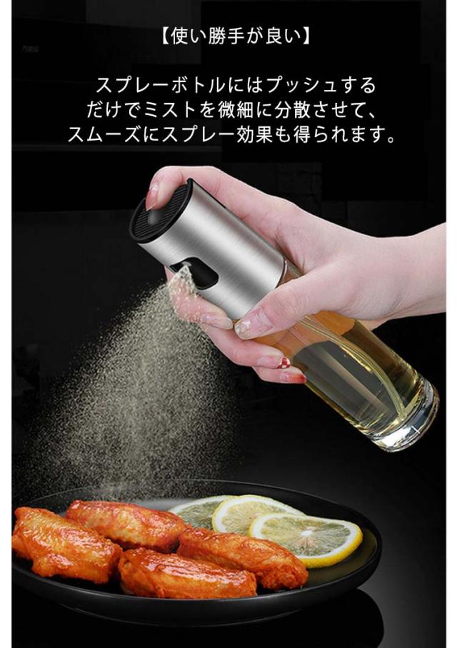 | スプレーになるので、油を均一的に霧吹くことが可能です。 過度な油分摂取を抑えることができますので、油分を気にする場合やダイエットには効果的です。 【色んなシーンで大人気】キャノーラ油、大豆油、サラダ油、オリーブオイルなど市販食用油はほとんど全種類適用します。 キッチン/台所/バーなど幅広い場合に適用します。そして、キャンプ、BBQなど戸外で持ち運びたい時も、お気軽に持ち歩けますよ。便利なオイルスプレーボトルです。 【使い勝手が良い】スプレーボトルにはプッシュするだけでミストを微細に分散させて、スムーズにスプレー効果も得られます。更に、加圧式霧吹きではなく、何度もプッシュする手間が省けるため、圧倒的に効率がアップします。細かいスプレー効果になるので、油をムラなく吹き付けることが可能です。 【ガラス製でお手入れ簡単】透明なガラス製で、プラスチックに比べると表面の汚れが落としやすく、食器洗い用洗剤で簡単に綺麗にできるので、お手入れがしやすいのも。耐熱ガラスですので、うっかり火のそばに置いてしまっても安心です。 | |