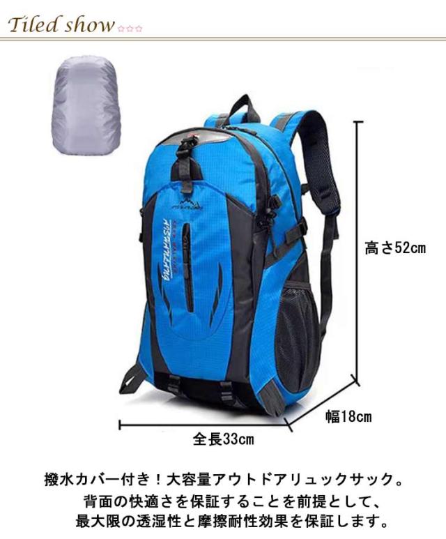 | アウトドアや登山、旅行用だけでなく、通勤通学などにも使える大容量リュックです! 撥水カバー付き!大容量アウトドアリュックサック。 大容量リュックサック、ポケットが多く、衣類・靴、及び他の登山用品を収納でき、登山や長期旅行に最適な大容量モデル。 背面の快適さを保証することを前提として、最大限の透湿性と摩擦耐性効果を保証します。 軽量なので女性でも安心です。 | |