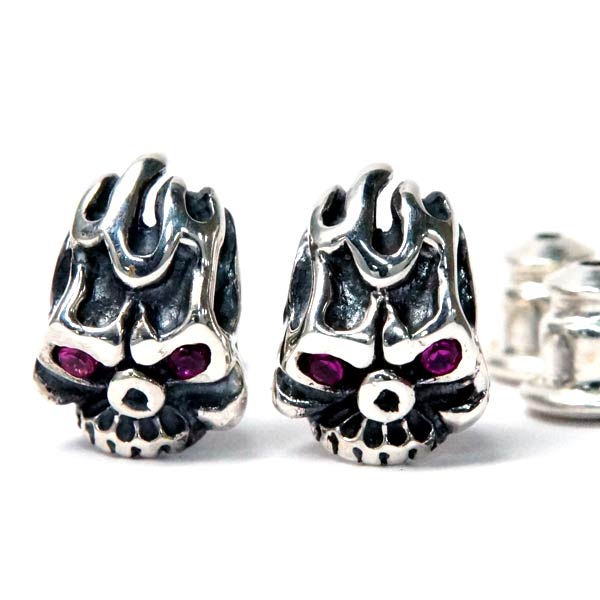 シルバー925 スタッド ピアス 天然石 ガーネット ドクロ 骸骨 スカル ファイヤー トライバル ヘッド メンズ