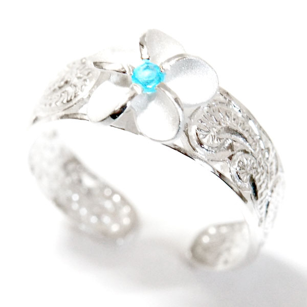 ハワイアンジュエリー トゥーリング プルメリア 花 ライトブルージルコニア カレイキニ 透かし彫り レディース シルバー925