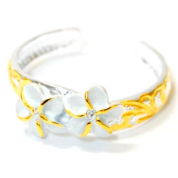ペアで飾られた人気のプルメリアをメインモチーフとしたハワイアンジュエリートゥーリングです。寄り添う恋人同士のようにペア飾られたプルメリアの姿がとっても可愛いですね。花びらを縁取るイエローゴールドの色使いが真っ白な花にとても鮮やかに映えています。それぞれの花にはクリアキュービックジルコニアが付いていますので、動くたびにキラキラと輝きを放ち出し十分な存在感をアピールしてくれます。リング本体の装飾には、アーム部分に【パワー】の意味を持つ【高貴な波/カレイキニ】というスクロールパターンが刻まれています。カレイキニの美しいシルエットは無数のドット柄と力強く渦巻くたくさんの波模様で見事に表現されています。波の縁取りにも使われたイエローゴールドの色鮮やかな輝きが、リングデザインに大人びた印象とエキゾチックな雰囲気をイメージさせる重要なアクセントになっています。トゥーリングだけではなくピンキーリングとしても使えるお得な2WAYですので、季節を華やかに彩るアクセサリーとしてオススメするハワイアンジュエリートゥーリングです。