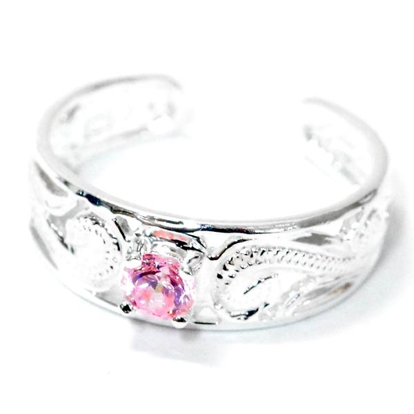 キュートなピンクストーンをメインに使ったハワイアンジュエリートゥーリングです。装飾のメインとなるピンクキュービックジルコニアは、やわらかなピンクの色彩がとってもキュートで女性らしい可憐なイメージを十分にアピールしてくれます。ピンクキュービックジルコニアは石が最も美しく輝くと言われるラウンドブリリアントカットで仕上げられ、多面体カットが放つ煌びやかな光彩は可憐さに加えエレガントな雰囲気もプラスされています。リング本体の装飾には、『幸せを運ぶ美しい波』と言われる“スクロール”波模様がとても繊細に刻まれています。透かし彫りとされたスクロールの波模様はアーム後方にまで続くしなやかな流線で表現されていて【永遠に途切れることのない愛】の意味に違わぬ美しいシルエットを見せています。キュート&エレガントなピンクストーンの輝きとスクロールの美しい彫り模様を併せ持ったこちらの華やかなトゥーリングは、ピンキーリングとしても使えるお得な2WAYですので、ひとつ持ってるだけでとっても重宝するハワイアンジュエリートゥーリングです。
