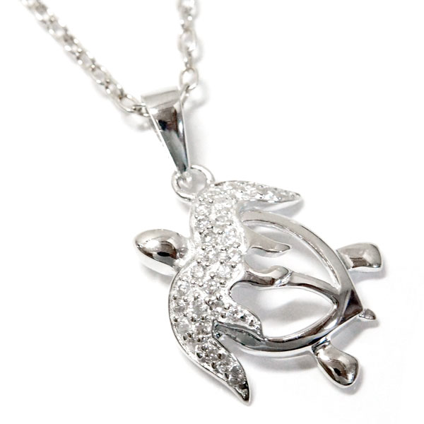 亀 ホヌ ウミガメ ハワイアンジュエリー ペンダント ネックレス 波 ウェーブ クリアジルコニア パヴェ レディース シルバー925
