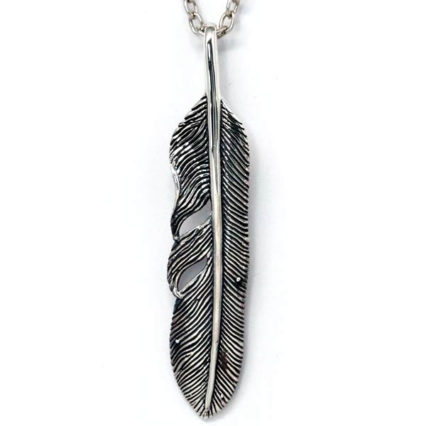 男女年代問わず人気定番中の定番・イーグルフェザーをモチーフに、鷲のワンポイント装飾でワイルド感十分のイメージに仕上げられたインディアンジュエリーシルバー925メンズペンダントネックレスです。ベース&メインとなるフェザーは躍動感のあるウェイブラインと破れた羽模様が特徴的なブレイクデザインで、胸元から発揮されるワイルドな存在感はもちろん抜群です!両面に羽模様彫りを施すなど丁寧かつしっかりと作り込まれています。フェザーの上部にはイーグル彫りがワンポイントで装飾されており、シンプルなデザインにネイティブアメリカンらしいオシャレなアクセントを付けています。画像では少し分りづらいかも知れませんが、羽軸の上部に高品質なシルバーの証明でもある925の刻印が小さいながらもちゃんと入っています。大型サイズ&シンプルなヘッドデザインでスタイルを男っぽくワイルドに纏めたい方に、当店がぜひオススメするインディアンジュエリーシルバー925メンズペンダントネックレスです。