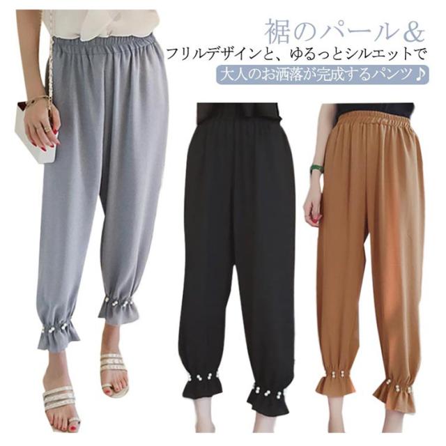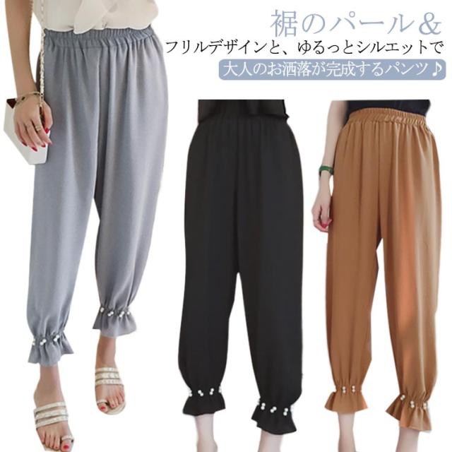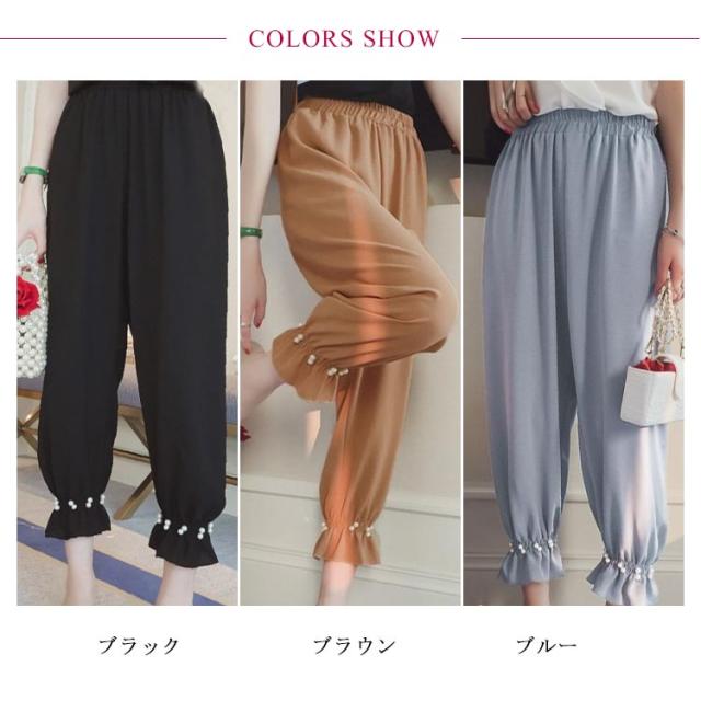 パールパンツ ストレートパンツ テーパードパンツ 美脚 ジョガーパンツ レディース 裾ゴム リラックスパンツ ロングパンツ きれいめ オケージョン オフィス カジュアル 大人かわいい 送料無料 パール フリル パステル ブラック ブラウン ブルー