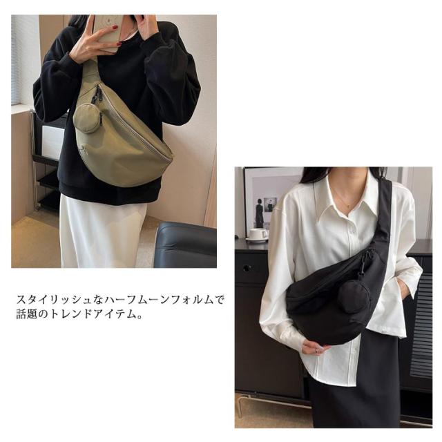| カジュアルでお洒落なシルエットのショルダーバッグ。 スタイリッシュなハーフムーンフォルムで話題のトレンドアイテム。 ニュアンス感のある大人キレイめカジュアルスタイルを目指します。 開口部のファスナーは大きく開く仕様で物の出し入れもスムーズに。 学生さんから年配の方まで、幅広い年代にもご利用いただけます! | |