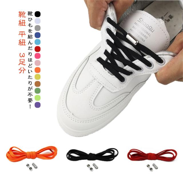 結ばない 靴紐 ゴム 平紐 ほどけない 安全 子供 大人 レディース メンズ スニーカー 運動靴 伸びる 100cm 替えひも 無地 くつひも シューレース 左右3セット 3足分 結ばない靴紐 靴ひも リノウル カジュアル カラフル 通勤 通学 靴アクセサリー 送料無料 カラバリ豊富