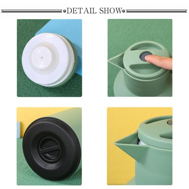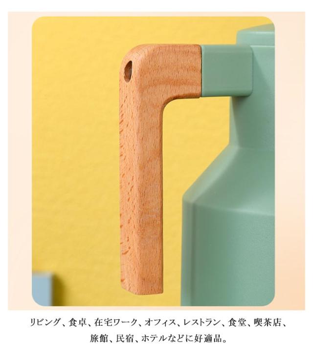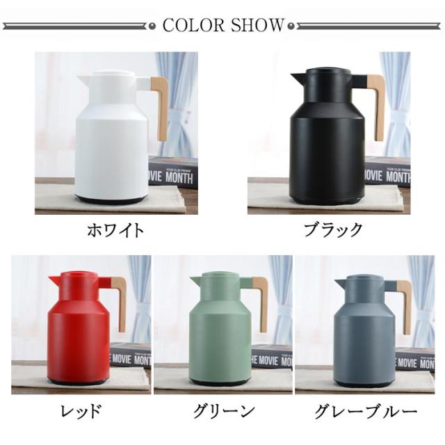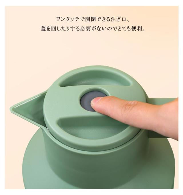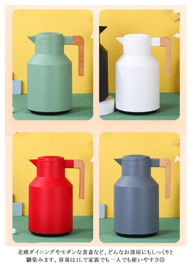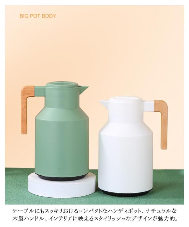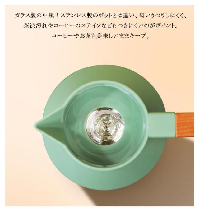 | ニオイ移りが少ないガラス製魔法瓶。 真空断熱構造のガラス製魔法瓶なので、熱を逃さず、保温・保冷効果抜群!冬はホットで、夏アイスで、電気を使用しないので、とってもエコ。一年中重宝する間違いなし! ガラス製の中瓶!ステンレス製のポットとは違い、匂いうつりしにくく、茶渋汚れやコーヒーのステインなどもつきにくいのがポイント。コーヒーやお茶も美味しいままキープ。 テーブルにもスッキリおけるコンパクトなハンディポット、ナチュラルな木製ハンドル、インテリアに映えるスタイリッシュなデザインが魅力的。 ワンタッチで開閉できる注ぎ口、蓋を回したりする必要がないのでとても便利。 北欧ダイニングやモダンな書斎など、どんなお部屋にもしっくりと馴染みます。容量は1Lで家族でも一人でも使いやすさ◎ リビング、食卓、在宅ワーク、オフィス、レストラン、食堂、喫茶店、旅館、民宿、ホテルなどに好適品。 | |