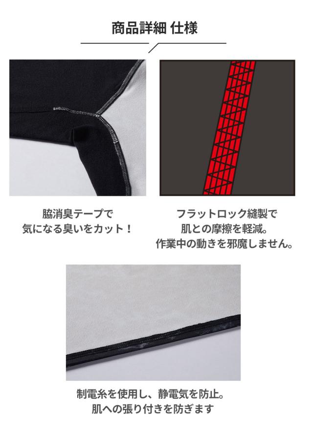 消臭テープ(両脇)、制電糸(裾)、フラットロックシーム縫製
