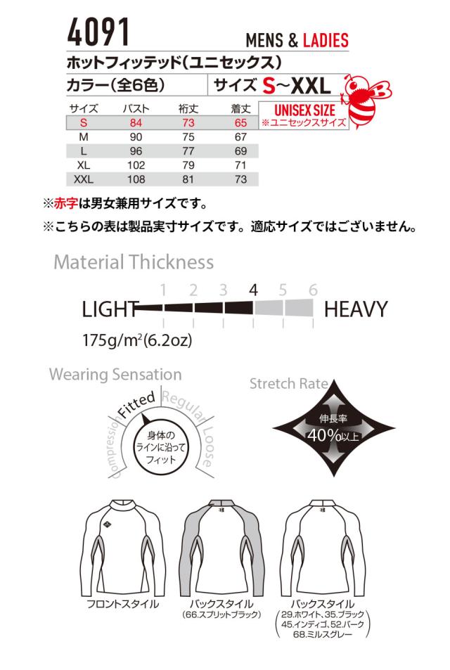 防寒インナー 長袖 バートル BURTLE ホットフィッテッド 4091 冬用 暖かい