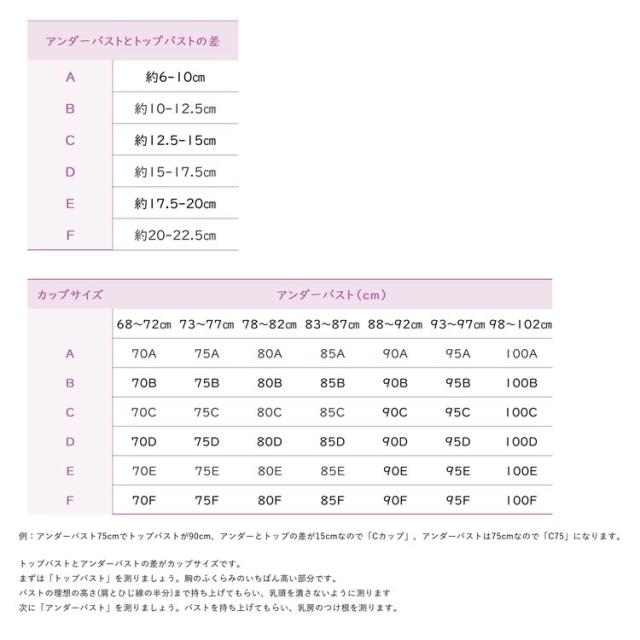 | サイズ | 34B/75B 36B/80B 38B/85B 40B/90B 42B/95B 34C/75C 36C/80C 38C/85C 40C/90C 42C/95C 34D/75D 36D/80D 38D/85D 40D/90D 42D/95D |