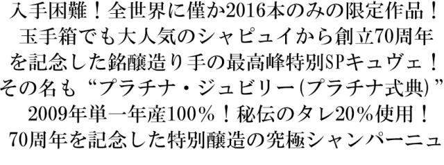 入手困難!全世界に僅か2016本のみの限定作品! 玉手箱でも大人気のシャピュイから創立70周年 を記念した銘醸造り手の最高峰特別SPキュヴェ! その名も“プラチナ・ジュビリー(プラチナ式典)” 2009年単一年産100%!秘伝のタレ20%使用! 70周年を記念した特別醸造の究極シャンパーニュ ■さまざまなギフトアイテムをご用意しております。お中元 ギフト 御中元 お盆 お礼 敬老の日 クリスマス 冬ギフト お歳暮 御歳暮 お年賀 御年賀 お正月 年末年始 ご挨拶 バレンタイン ホワイトデー お返し 父の日 母の日 ギフト 贈答品 お土産 手土産 御祝 御礼 内祝い 引き出物 お祝い 結婚祝い 結婚内祝い 出産祝い 出産内祝い 引き菓子 快気祝い 快気内祝い 進学祝い 誕生日祝い バースデーケーキ プレゼント Wedding ウェディング ホームパーティ お花見 パーティ 退職ギフト 退職 就任祝い