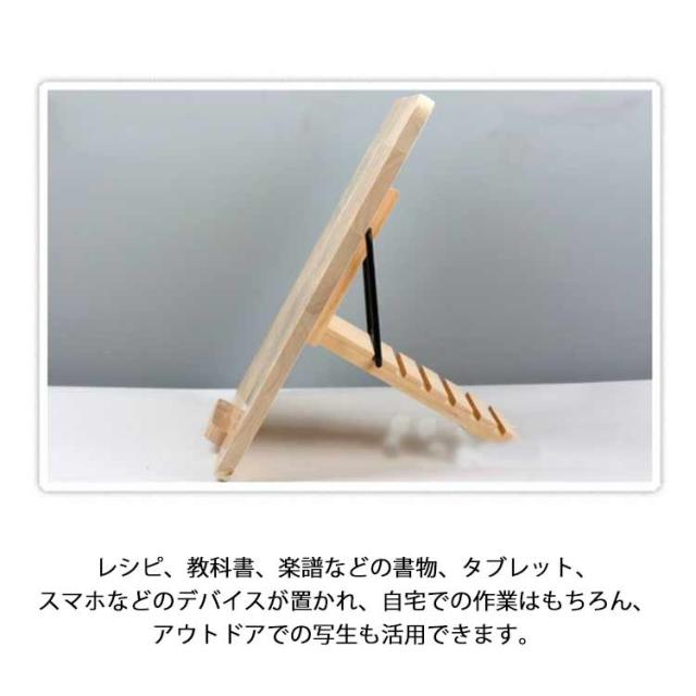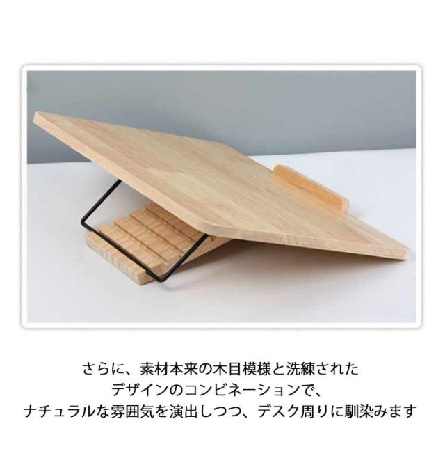 | 【上質な天然木素材】天然木素材を厳選して作られており、滑らかな質感に仕上がり、気になるニオイやバリがなく、心置きなくご利用頂けます。環境に優しい素材なので、お子様のいるご家庭にも安心してお使い頂けます。また、しっかりとした作りで変形しにくく、優れた耐久性を実現します。さらに、素材本来の木目模様と洗練されたデザインのコンビネーションで、ナチュラルな雰囲気を演出しつつ、デスク周りに馴染みます。 【5段階高さ調整可能】ブックスタンドの傾斜角度は5段階調整可能で、使用シーンや用途により、使用者の姿勢に合わせて自由に設置できます。ABS製のサポートアラームにより、様々なデバイスを支えられます 【快適な使い心地】人間工学に基づいて設計され、適切な使用角度より首周りの不快感や肩のこりを和らげ、長時間勉強や仕事しても疲れにくいです。また、猫背などの不良姿勢から解放し、自然と良い座り方や習慣を身につけます。学生さんや社会人に重宝のアイテムで、お子様や友達、同僚などへのギフトとしても喜んでもらえます。 【幅広く活躍】コンパクトなサイズで、持ち歩きやすく、いつでもどこでも便利にご利用いただけます。使用後は折り畳んで隙間に収納でき、スペースを取りません。レシピ、教科書、楽譜などの書物、タブレット、スマホなどのデバイスが置かれ、自宅での作業はもちろん、アウトドアでの写生も活用できます。学校、オフィス、図書館、キッチン、新幹線移動など幅広いシーンで活躍します。 | |