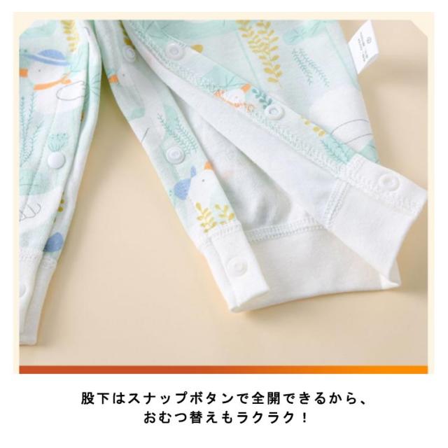 | お肌に優しいベビー服は赤ちゃんも嬉しいパジャマ! 59cmサイズから90cmサイズまでを取り揃え、小学生/ベビーも着用できるようになっている。 肌触り優しい生地で、通気性・吸汗性も抜群、大切なお子様により快適な快眠を◎ 股下はスナップボタンで全開できるから、おむつ替えもラクラク! | |