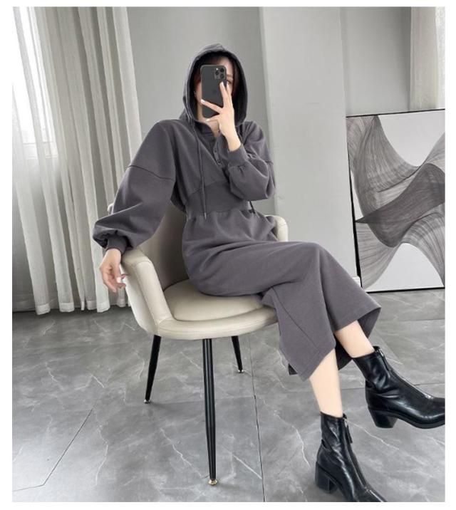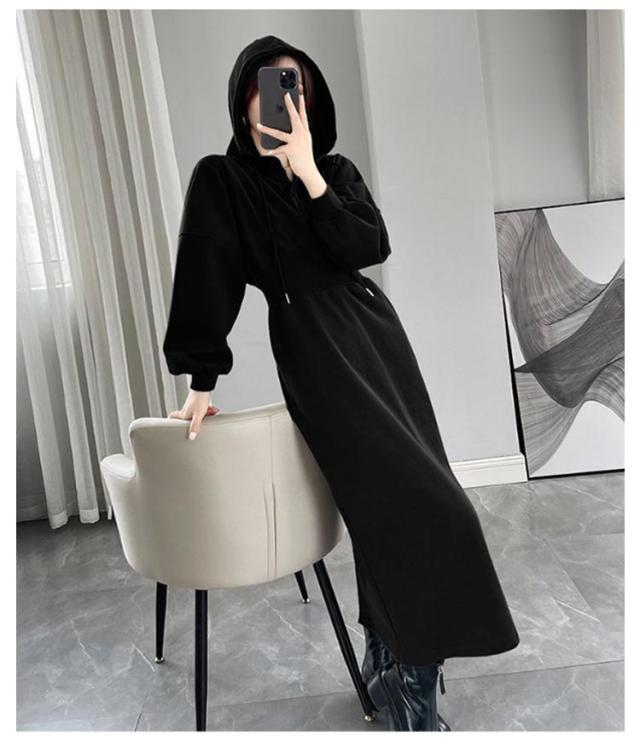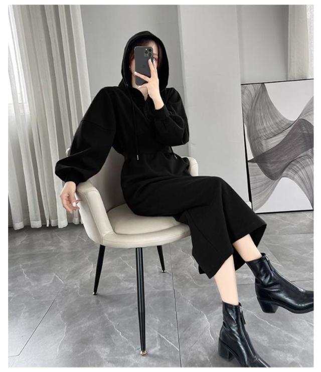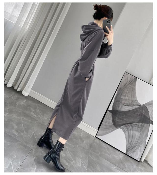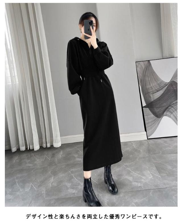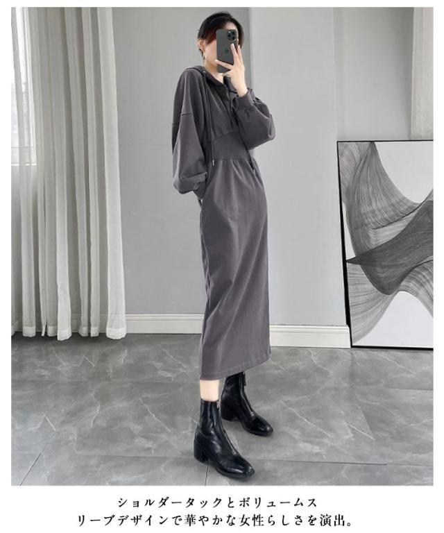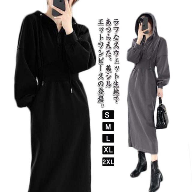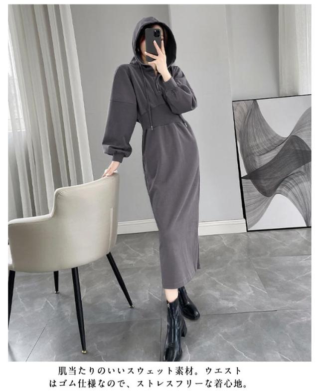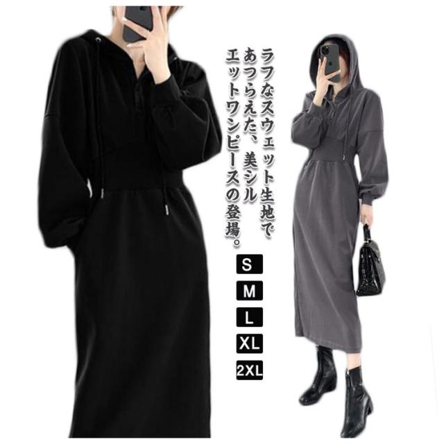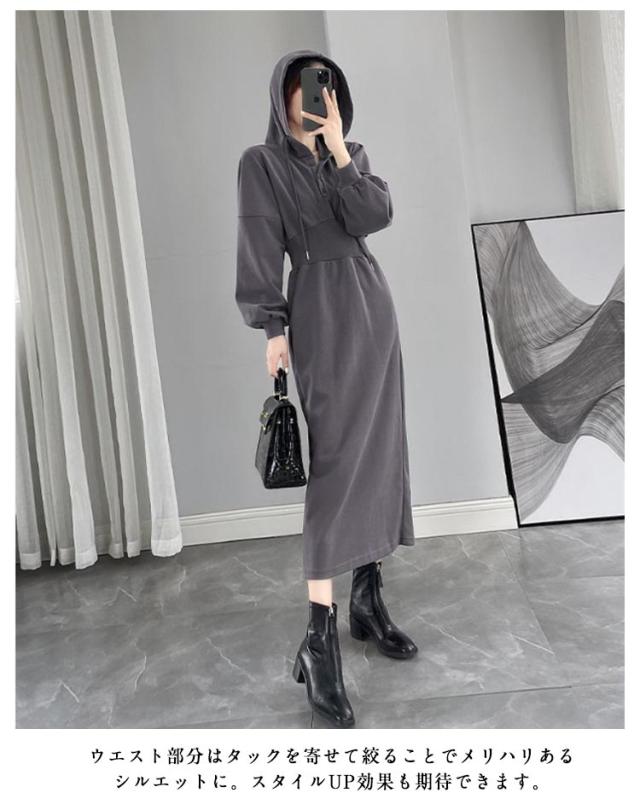 ウエストマーク スウェットワンピース レディース スウェット パーカー トレーナー ジャージ ワンピース ポケット付き ウエストシェイプ タック ウエストマーク スタイルアップ 二の腕カバー 楽ちん ロング丈 ブラック グレー