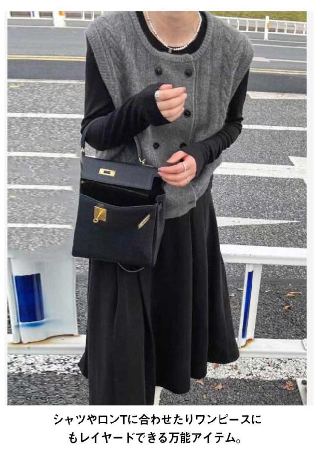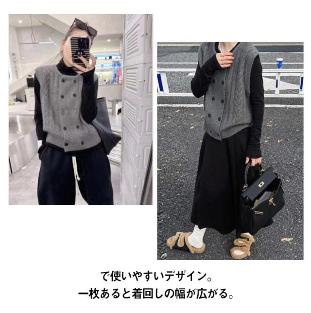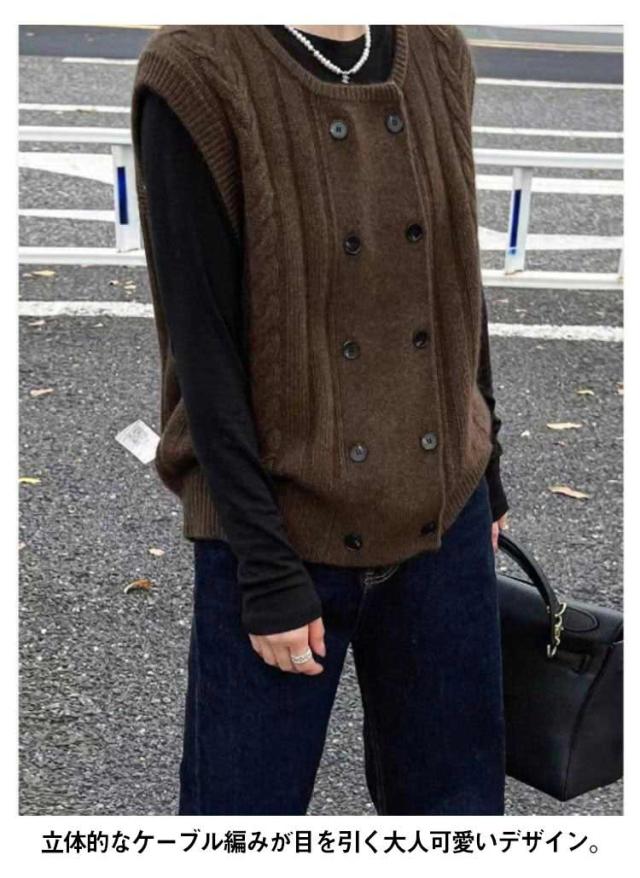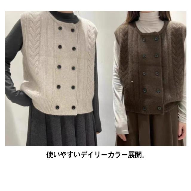 | 秋冬大活躍なニットベスト で使いやすいデザイン。一枚あると着回しの幅が広がる。 シャツやロンTに合わせたりワンピースにもレイヤードできる万能アイテム。 立体的なケーブル編みが目を引く大人可愛いデザイン。 気軽に取り入れやすく、秋冬らしい季節感もしっかりと演出してくれる。 季節の移り変わりの時期、アウターを羽織るまでもない時期、1枚プラスするだけで秋冬コーデの完成です。 使いやすいデイリーカラー展開。 | |