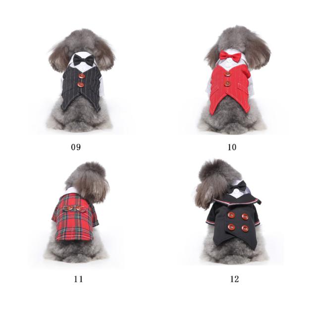 | 全17種類!ペット用タキシード。大切な記念日の晴れ着におすすめ。 家族の御祝い事への参加時はもちろん、イベント時など視線を釘付け! 背中のボタンのアクセントや首元のリボンなどおしゃれ要素がイロイロ。 お誕生日、うちの子記念日、節句や七五三などなど記念日の撮影にもぴったりです。 | |