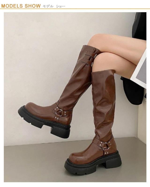 ジョッキーブーツ ニーハイブーツ ロングブーツ レディース 膝丈 レディース 厚底ロングブーツ 厚底 ロング丈 太ヒール 秋冬 ブーツ 靴 美脚 ファスナー付き シンプル おしゃれ カジュアル 韓国 大人 ブラウン ブラック