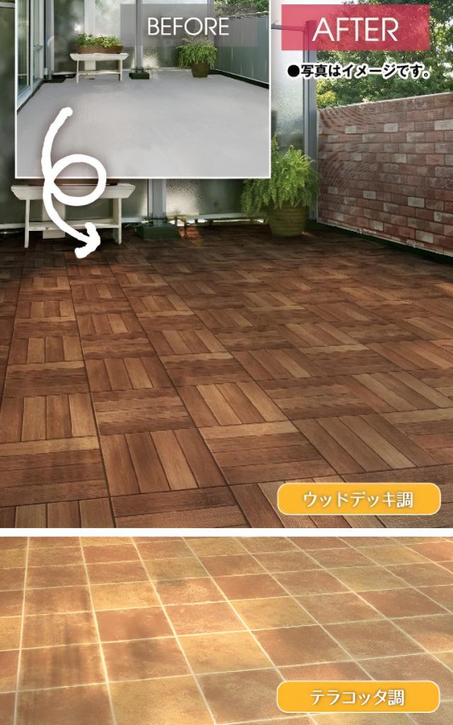 コンクリートの床の上に敷くだけで簡単に設置できる装飾用フロアシートです。お庭やベランダ、玄関周りなどを素敵にイメージチェンジできます。柄はウッドデッキ調とテラコッタのタイル調の2つからお選びいただけます。