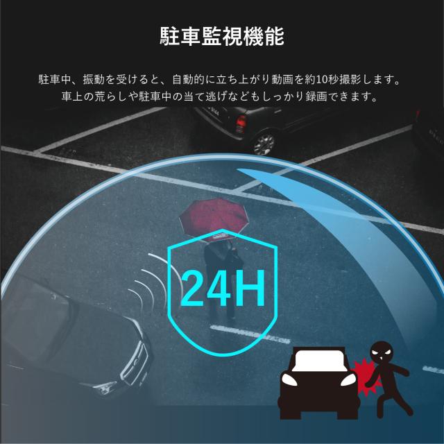 ★\駐車監視機能付き/駐車中、振動を受けると、自動的に立ち上がり動画を約10秒撮影します。車上の荒らしや駐車中の当て逃げなどもしっかり録画できます。