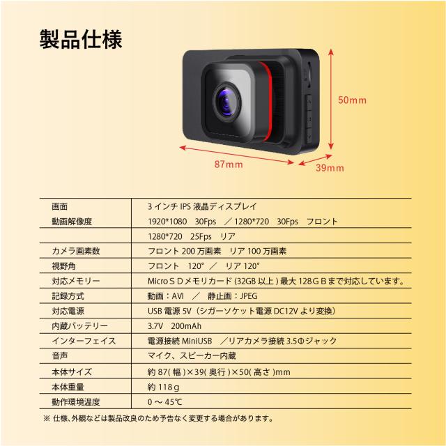 インターフェイス:電源接続MiniUSB /リアカメラ接続3.5Φジャック