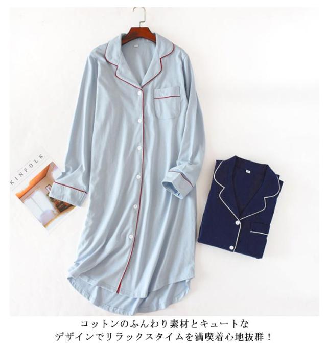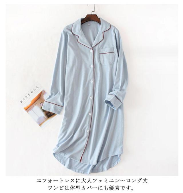 ネグリジェ 前開き パジャマ ワンピース 綿 秋 春 長袖 ふんわりガーゼ ガーゼ コットン 無地 ストライプ 襟 レディース 産後 授乳 ルームサプリ M L サイズ ルームサプリ