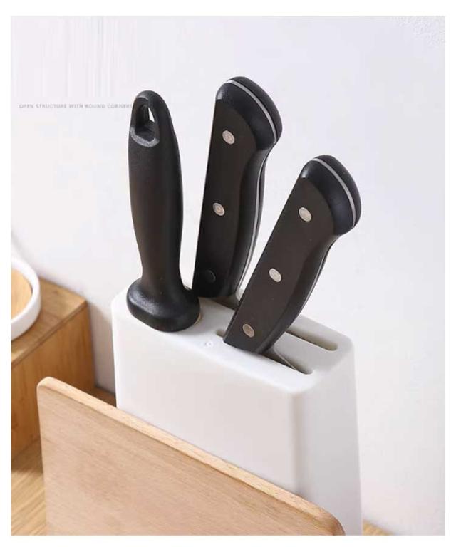 | ナイフスタンド&まな板スタンド!包丁もまな板もすっきりまとめる! 両用ラック♪サイズや用途違いの包丁3本とまな板2枚をスッキリに収納でき、コンパクトで大容量、狭いキッチンスペースを有効活用できます。 水気を逃す通気性♪水受けトレイでスタンド内に水気が残らないので雑菌やカビの繁殖を抑え、とても衛生的に使用できます。 サイズ違いのまな板を収納可能♪まな板おき部分は、厚みの異なるまな板も安定して置けるよう、幅の異なるものを用意しました。 シンプルなデザイン♪シンプルでおしゃれな包丁・まな板スタンドで、キッチン周りをスタイリッシュに演出します。不透明なデザインは収納した包丁をうまく隠し、キッチンをより美しくします。 | |