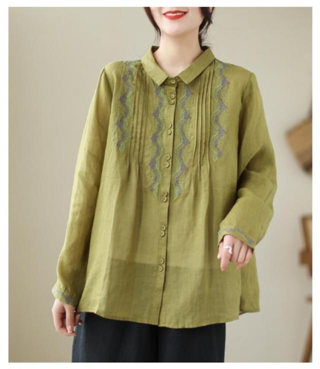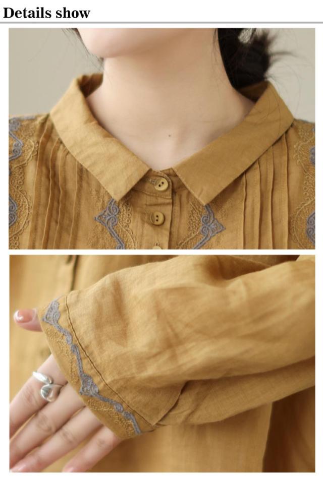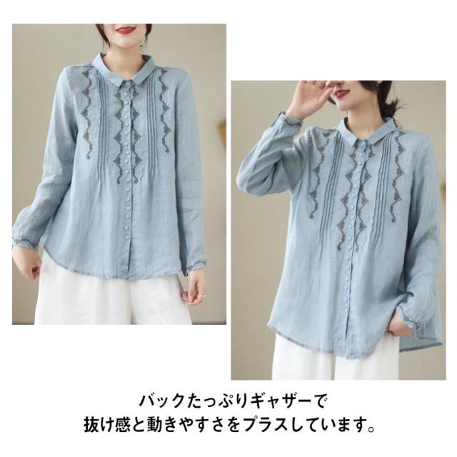 リネンシャツ 長袖 ブラウス チュニックシャツ 綿麻混 トップス 刺繍 刺繍ブラウス トップス 前開き リネン 麻 大人 薄手 ギャザー 可愛い 春夏 秋 新作 エスニック 体型カバー ゆったり Aライン