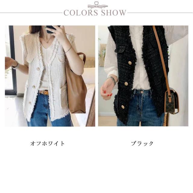 ツイードフリンジジレ ツイード ジレ ベスト ノースリーブ ツイードジャケット Vネック フリンジ レイヤード 裏地付き レディース 通勤 オフィス 卒業式 母 入学式 卒園式 入園式 セレモニー アウター 黒 オフホワイト 高見え