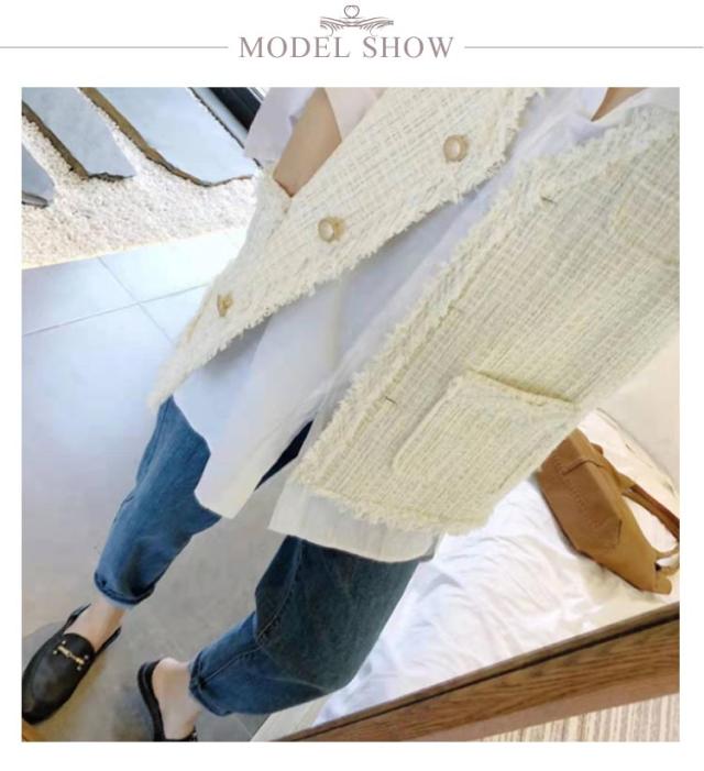 | 羽織るだけで旬スタイル完成♪ トレンドムードを高めるツイードジレベスト、お手持ちのコーディネートにプラスするだけでトレンドGET。 フリンジのディティールや、ゴールド釦もポイントとして効いています。 いつものTシャツ&デニムに羽織るだけで、一気にコーデをアップデート。 勿論チュールスカートなどのフェミニンなアイテムでエレガントに合わせても◎ | |