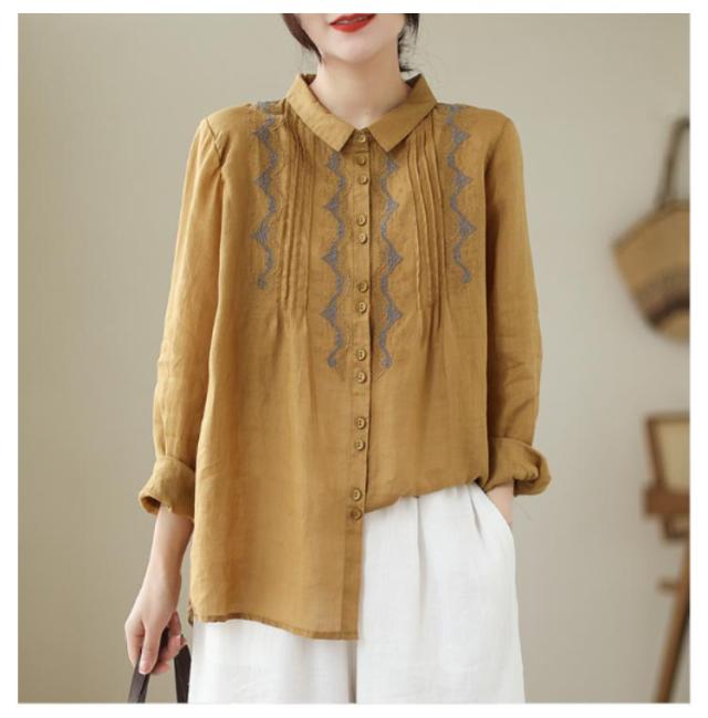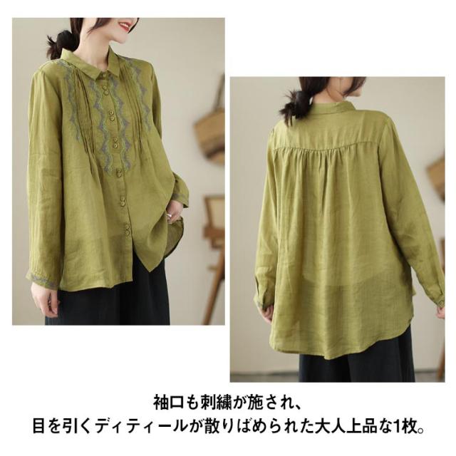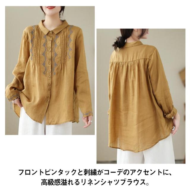 リネンシャツ 長袖 ブラウス チュニックシャツ 綿麻混 トップス 刺繍 刺繍ブラウス トップス 前開き リネン 麻 大人 薄手 ギャザー 可愛い 春夏 秋 新作 エスニック 体型カバー ゆったり Aライン