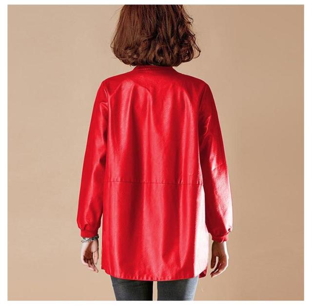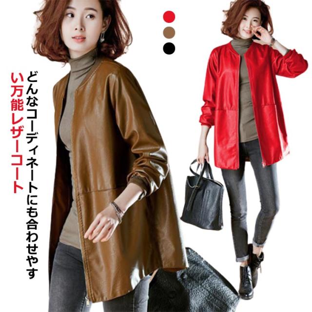 レザーコート レディース コート ロング丈 フェイクレザー ロングコート トレンチコート スタジャン PU 合皮 ジャケット コート ノーカラー ジップアップ ミドル丈 春秋 女性 スプリングコート 上品 軽量