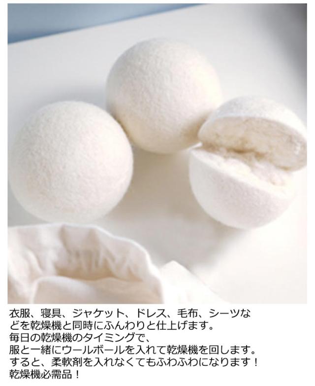 | 乾燥機に入れるだけ!ふんわり仕上がる洗濯用ウールボール。 乾燥時間短縮で電気代もカット!乾燥機に衣類と一緒に入れるだけの羊毛を使用したドライヤーボール。 乾燥機内でウールのボールが動き回ることで衣類の間に隙間を作り、効率よく熱風をあてて乾かします。 また、ドライヤーボールが水分を吸収してくれるので、乾燥時間短縮につながっています。 やわらかなボールがバウンドすることで、ボールが繊維を優しくマッサージしてくれるので、衣類の表面をやわらかくさせ、ふんわりとした仕上がりになります。 衣類との絡まりを抑えるので衣類の洗いシワを抑えてくれます。 可愛い巾着ポーチ付きです。 衣服、寝具、ジャケット、ドレス、毛布、シーツなどを乾燥機と同時にふんわりと仕上げます。毎日の乾燥機のタイミングで、服と一緒にウールボールを入れて乾燥機を回します。すると、柔軟剤を入れなくてもふわふわになります!乾燥機必需品! | |