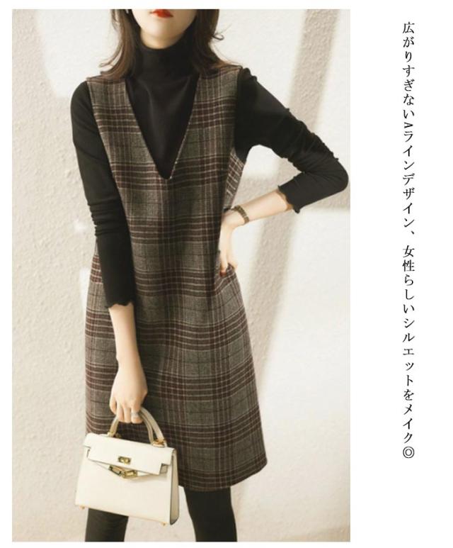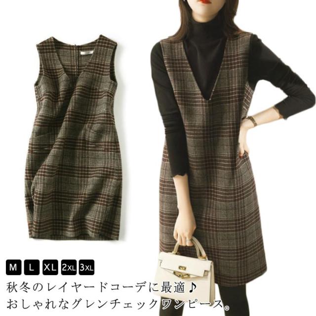 ジャンパースカート グレンチェック ワンピース 秋 冬 Vネック ジャンパースカート ミディアム丈 ノースリーブワンピース Aライン 重ね着 レイヤード フォーマル オフィスカジュアル 通学 通勤 秋 冬 可愛い カジュアル