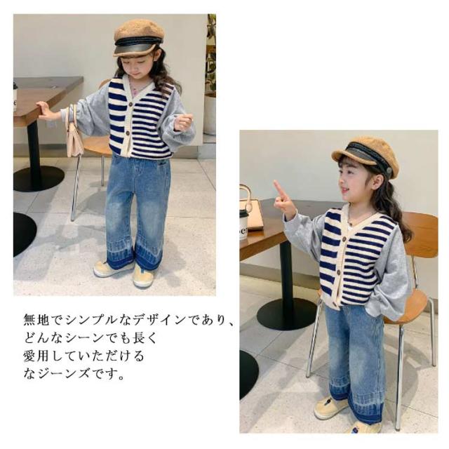 | キッズ用デニムパンツ 腰周りから裾まではゆったりとしたシルエットで、ストレスフリーな着用感。 広がりすぎないシルエットが、カジュアルすぎず、すっきりとした印象を与えるワイドデニム。 無地でシンプルなデザインであり、どんなシーンでも長く愛用していただけるなジーンズです。 デイリーコーデからお出かけコーデまで大活躍するデニムパンツは、1人1本は持っていたいアイテムです。 | |