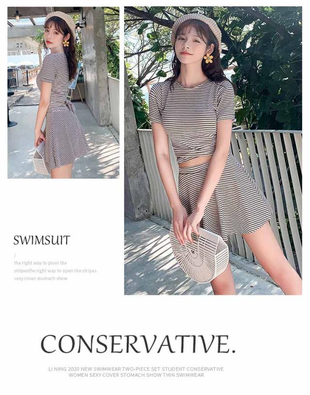 水着 高校生 2点セット 上下セット 女子 学生 中学生 ビキニ 縞 半袖 トップス スカート セット インナーパンツ付き セパレート 可愛い 大人 洋服みたい 流行 ボーダー リボン フレアスカート 送料無料